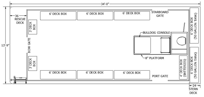Deck 34’ long – LOA 36’/ 13’11″ Beam