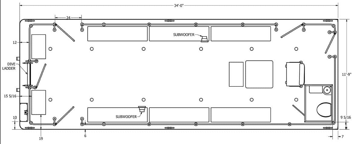 Deck 34’ long – LOA 36’/ 13’11″ Beam
